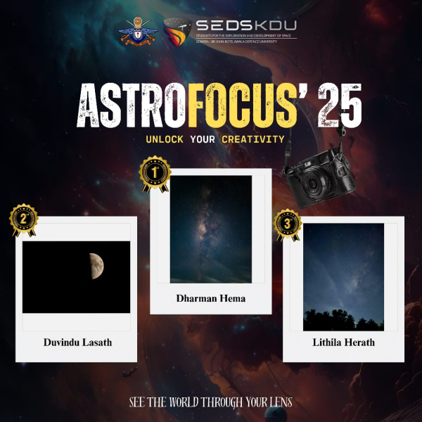 The Students for the Exploration and Development of Space – KDU (SEDS KDU) successfully concluded two of its flagship events for 2025 ASTROLIT ’25, the Article Writing Competition, and ASTROFOCUS ’25, the Astrophotography Contest. Both initiatives aimed to inspire creativity, scientific enthusiasm, and a deeper understanding of space and technology among the KDU community.